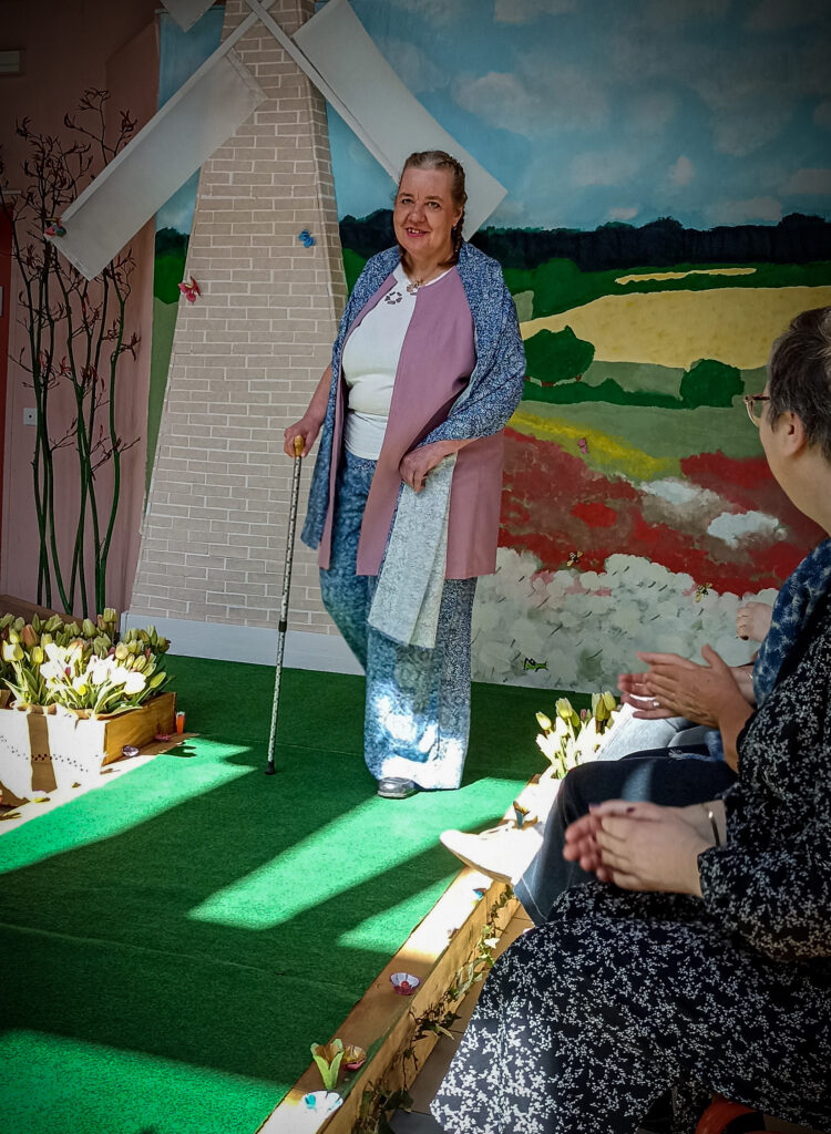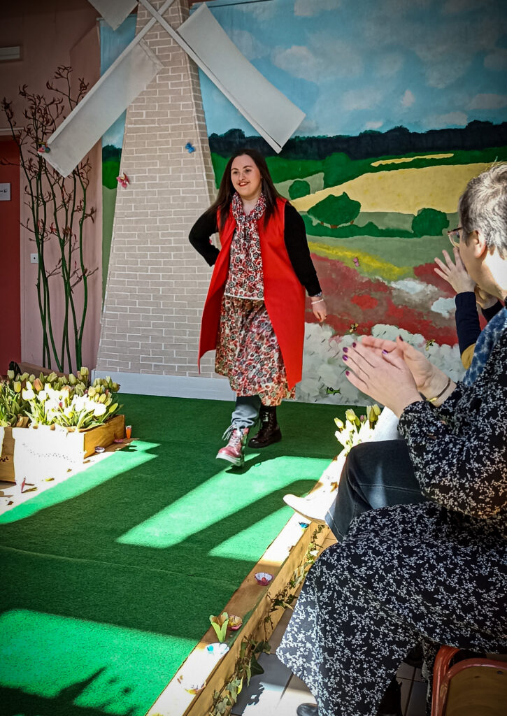 Le défilé de mode lui-même s’est inscrit dans une démarche de projet collectif, avec la participation d’autres activités de l’établissement. L’esthétique a été mise à l’honneur avec la réalisation de coiffures et de maquillages pour les mannequins. L’activité perles a permis la création de colliers et de bracelets pour accessoiriser les tenues. L’informatique a été sollicitée pour la préparation des affiches et invitations. La menuiserie et l’atelier peinture ont contribué à la réalisation du décor sur le thème du printemps. La pâtisserie a concocté des douceurs pour le pot qui a suivi le défilé, et l’atelier cuisine a assuré le service. Même la chorale a participé en présentant une chanson en ouverture de l’événement. Ainsi, chaque adulte de l’établissement a pu contribuer à sa manière à la réussite de cette manifestation.