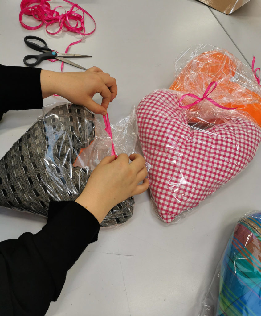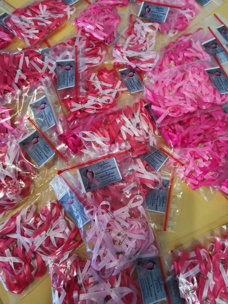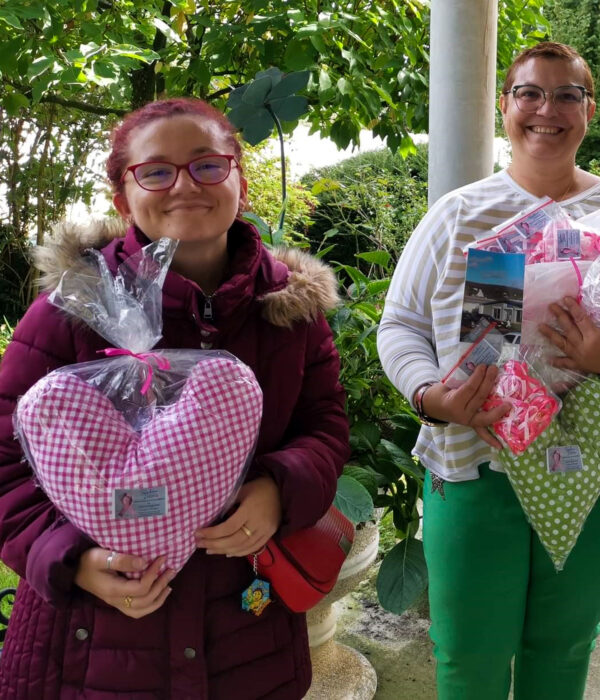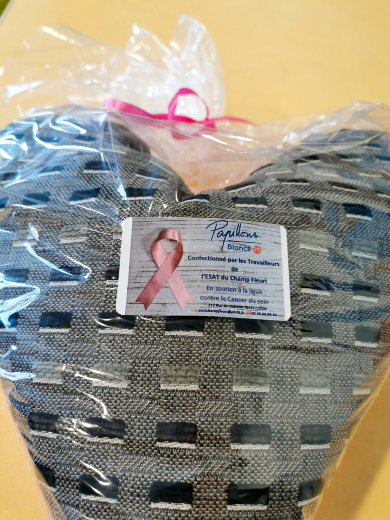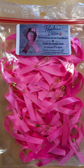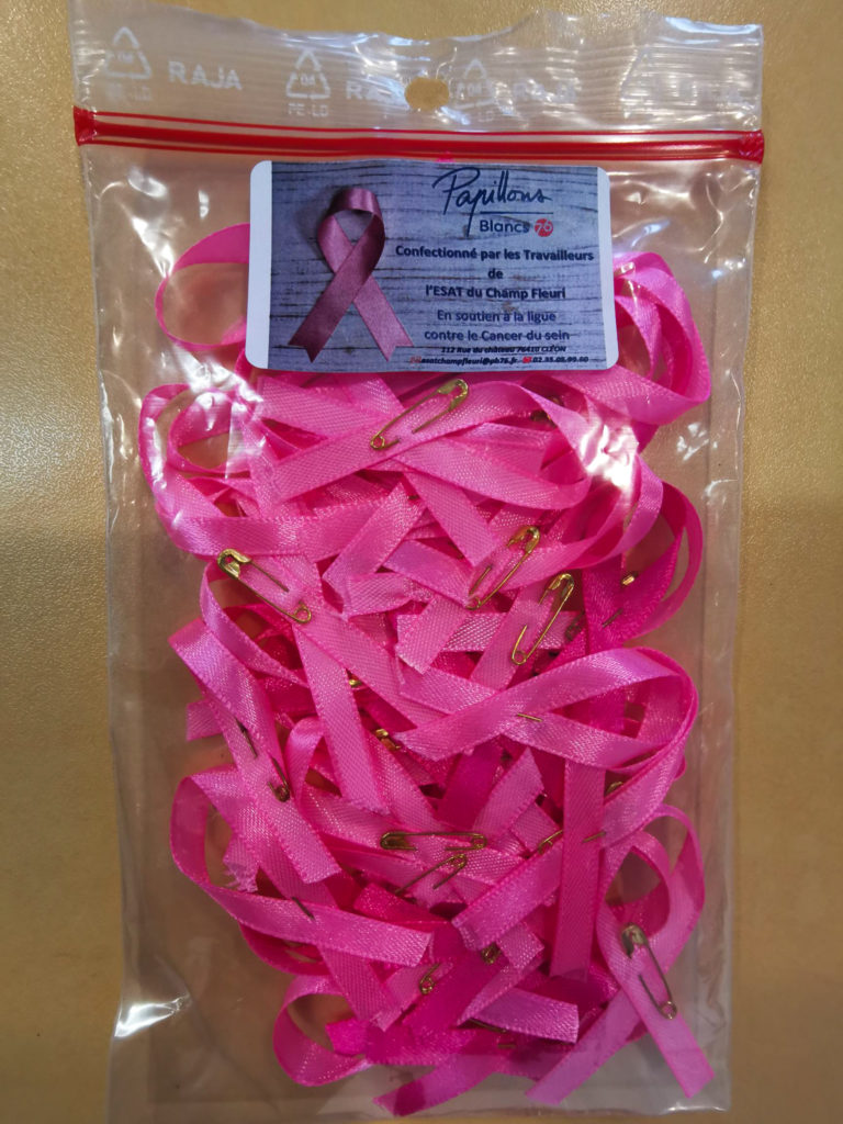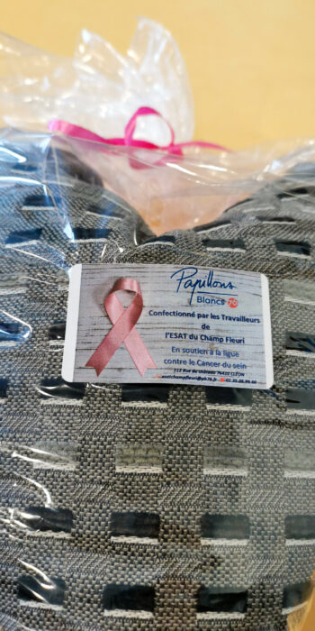 Depuis plusieurs années l’opération Octobre Rose est l’occasion pour l’ESAT du Champ Fleuri de montrer son soutient aux malades touché·e·s par le cancer du sein. Pour cette édition, une banderole avec en lettres roses « l’ESAT du Champ Fleuri et l’association Les Papillons Blancs 76 se mobilisent contre le cancer du sein » a été affichée sur la façade de l’établissement. Dans les ateliers c’est la fabrication des rubans roses et des coussins en forme de cœur qui a rythmé le mois. Les rubans ont été distribués par le Bosroumois rose aux commerçants de la ville d’Elbeuf. Les coussins ont été remis aux chirurgiens des hôpitaux le 1er octobre. Ces coussins sont utilisés par les personnes en chimiothérapie.