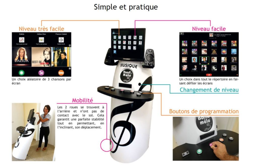 Développée par l’entreprise Onze Plus, cette curieuse borne interactive possède plusieurs fonctions. Spécialement adaptée à un public en situation de handicap, Handi-Mélo est un véritable juke box moderne. Plus de 2000 titres sont préenregistrés et classés dans sa carte mémoire. Et s’ils ne trouvent pas leur bonheur parmi la sonothèque, les utilisateurs peuvent connecter leur mobile, et jouer leurs playlists. En partant de là, les possibilités sont multiples : Karaoké, jeux, interactifs, séances de relaxation ou de gym douce, blind test, contes audio…